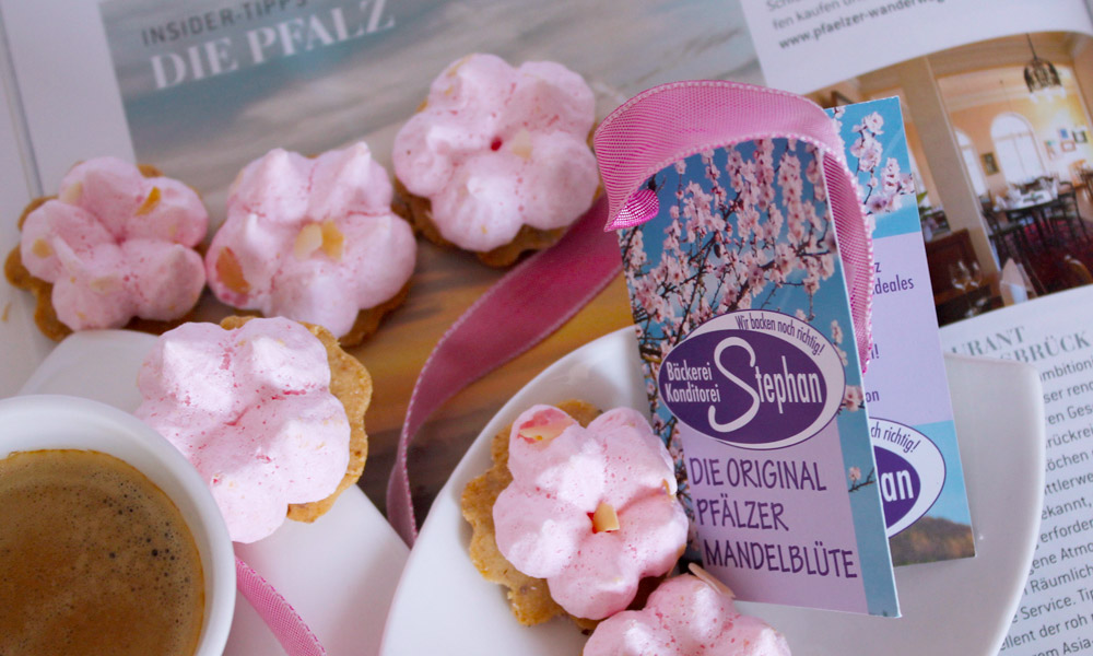 Dieses knusprige Mandelgebäck mit luftig zartrosa Baiser-Masse ist eine feine Leckerei zum Tee oder Kaffee aber auch zu einem Gläschen guten Pfälzer Wein. Dieses duftende Gebäck aus Mandelmürbeteig gibt es nur im Frühjahr zur Mandelblütenzeit.